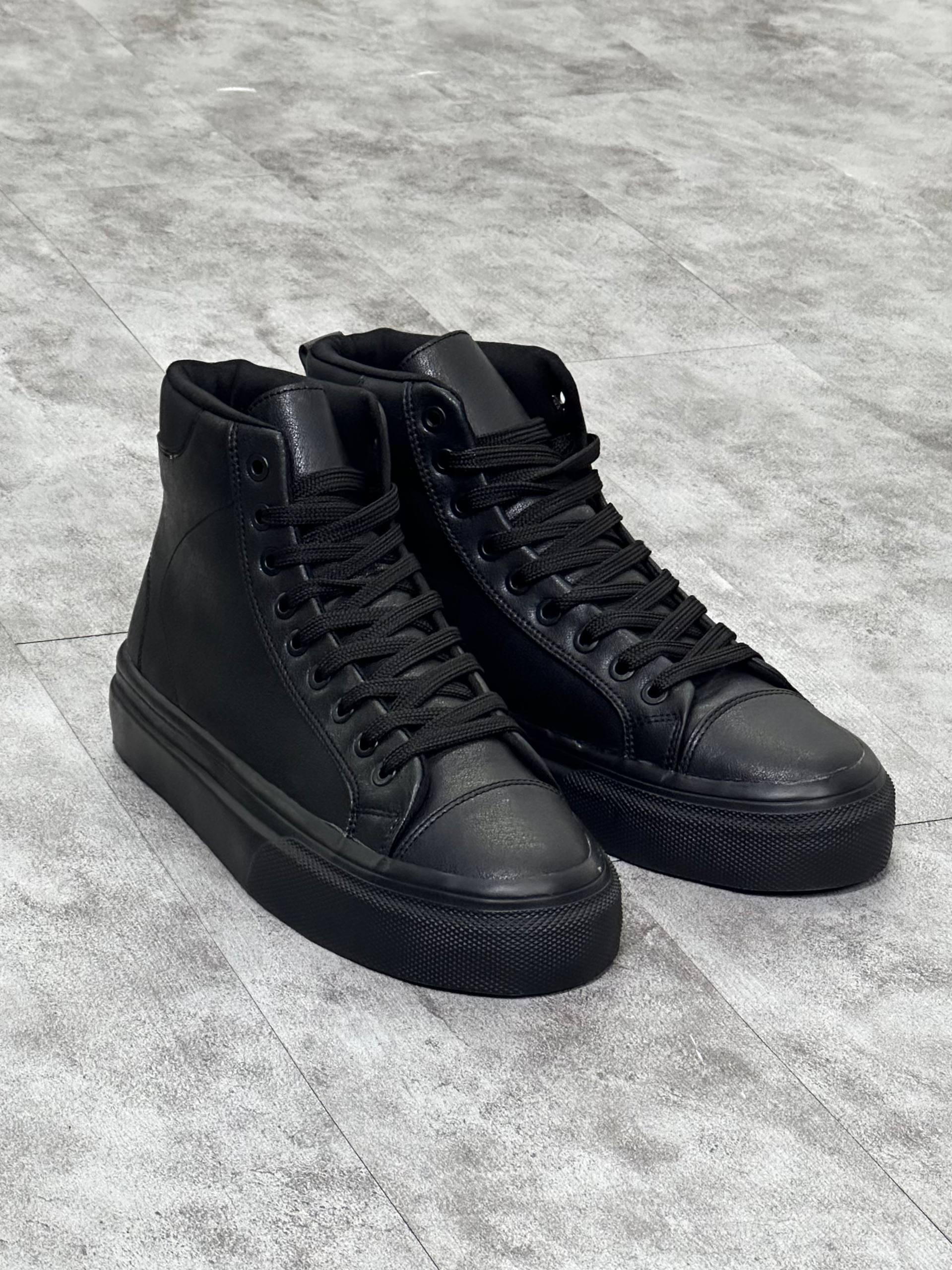 با این کفشهای اسپرت مشکی رنگ، استایل خود را به سطح بالاتری ببرید. این کفشها با طراحی کلاسیک و جلوبندی مشکی، مناسب برای استفاده روزمره یا گردشهای غیررسمی هستند. مواد چرم با کیفیت بالا ظاهری شیک و زیبا ایجاد کرده، در حالی که طراحی هایتاپ به شما پشتیبانی اضافی برای مچ پا میدهد. بندهای محکم و کفی لاستیکی مقاوم، همزمان ثبات و راحتی را برای شما فراهم میآورد